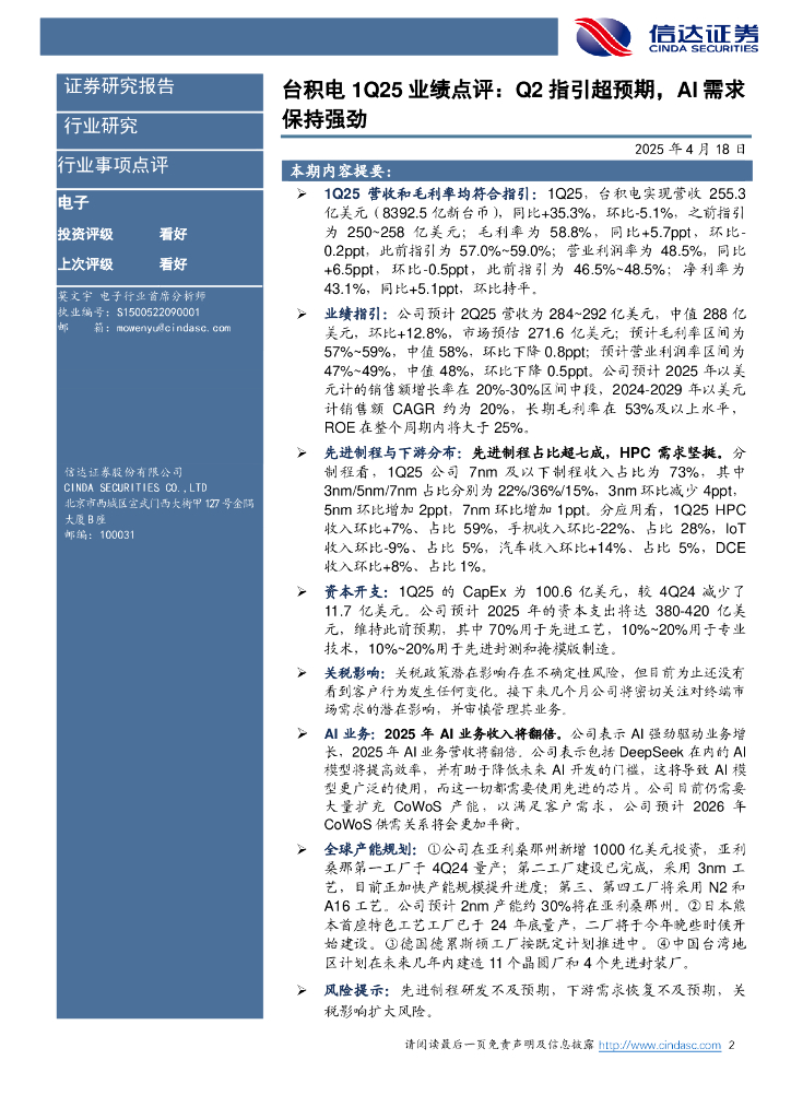 信达证券:电子行业事项点评:台积电1Q25业绩点评:Q2指引超预期,AI需求保持强劲.pdf
