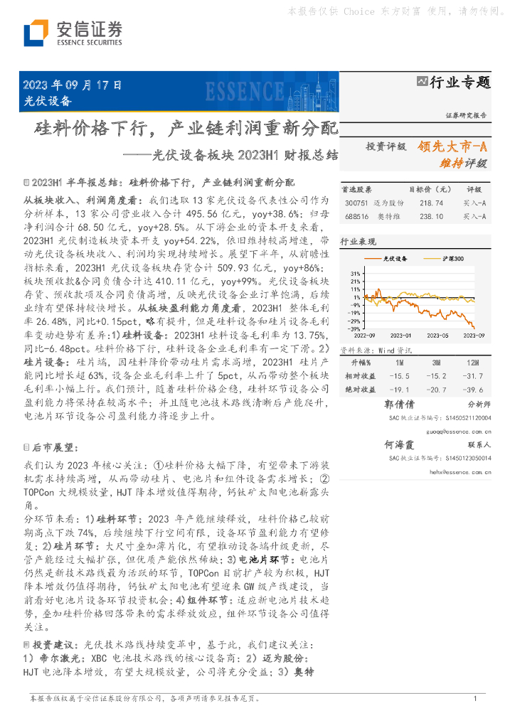 安信证券:光伏设备板块2023H1财报总结:硅料价格下行,产业链利润重新分配.pdf