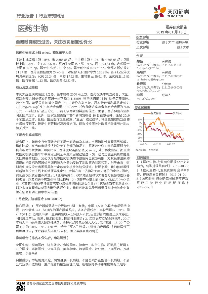 天风证券:医药生物行业研究周报:至暗时刻或已过去,关注板块配置性价比.pdf