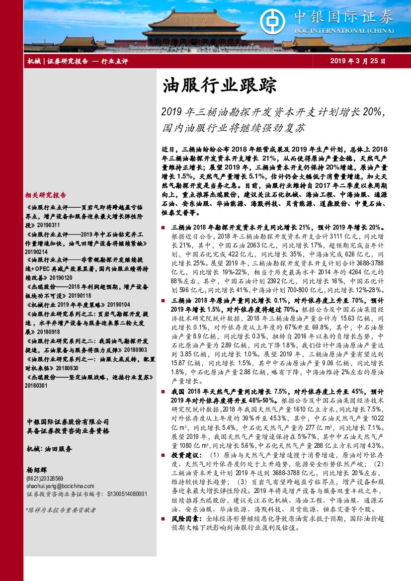 中银国际:机械油服行业跟踪:2019年三桶油勘探开发资本开支计划增长20%,国内油服行业将继续强劲复苏.pdf