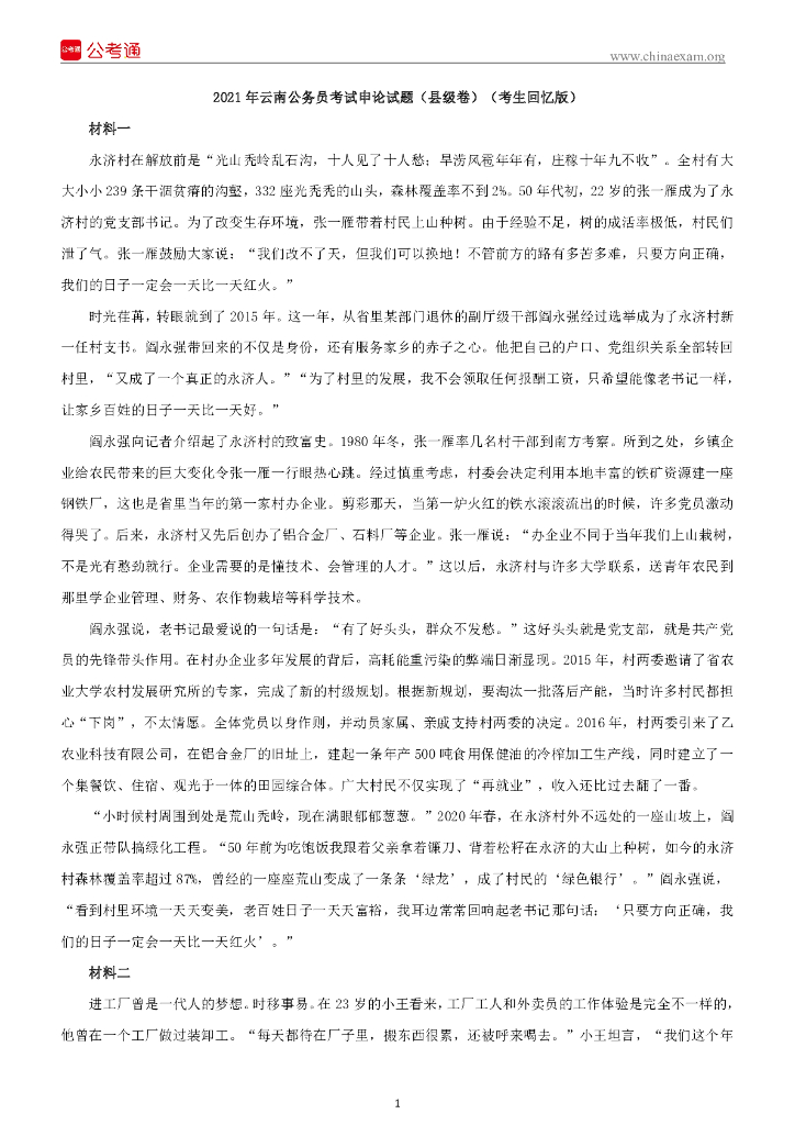 2021年云南公务员考试申论试题(县级卷)(考生回忆版).pdf