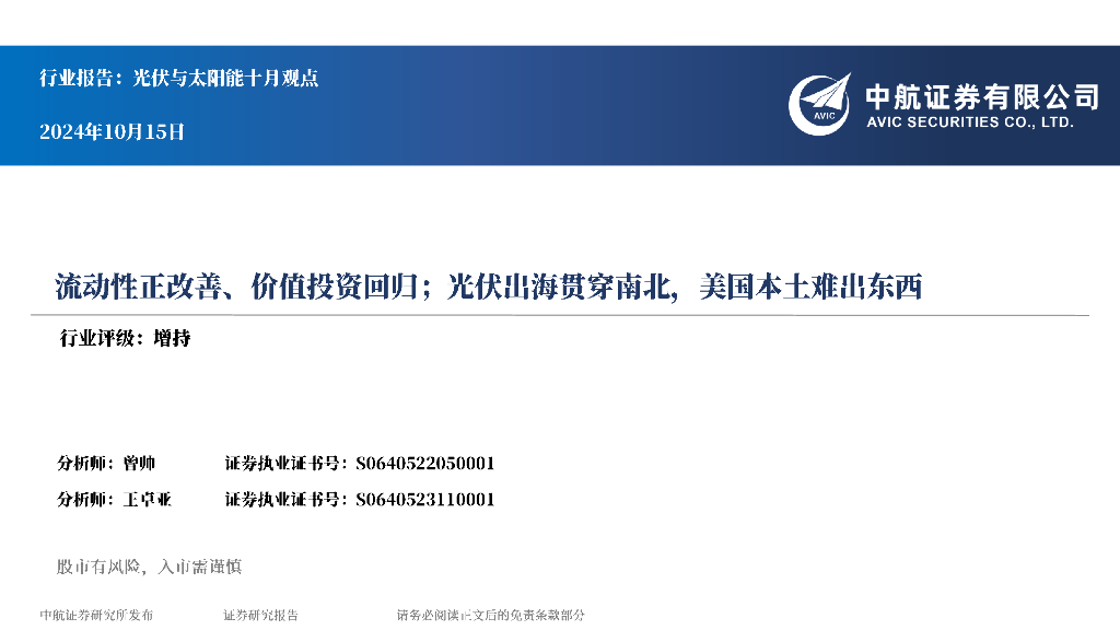 中航证券:光伏与太阳能十月观点:流动性正改善、价值投资回归;光伏出海贯穿南北,美国本土难出东西.pdf