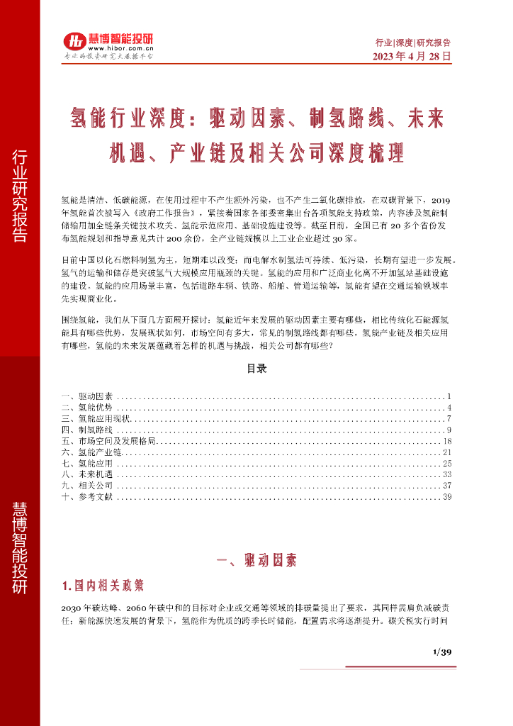 慧博智能投研:氢能行业深度:驱动因素、制氢路线、未来机遇、产业链及相关公司深度梳理.pdf