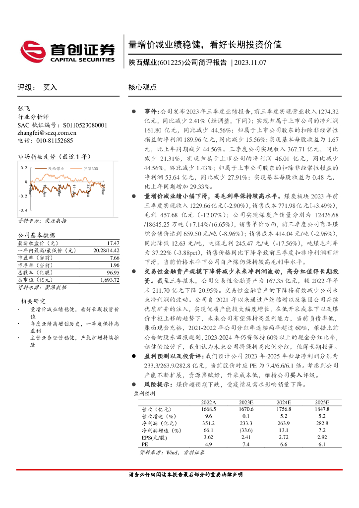 首创证券:陕西煤业(601225)-公司简评报告:量增价减业绩稳健,看好长期投资价值.pdf