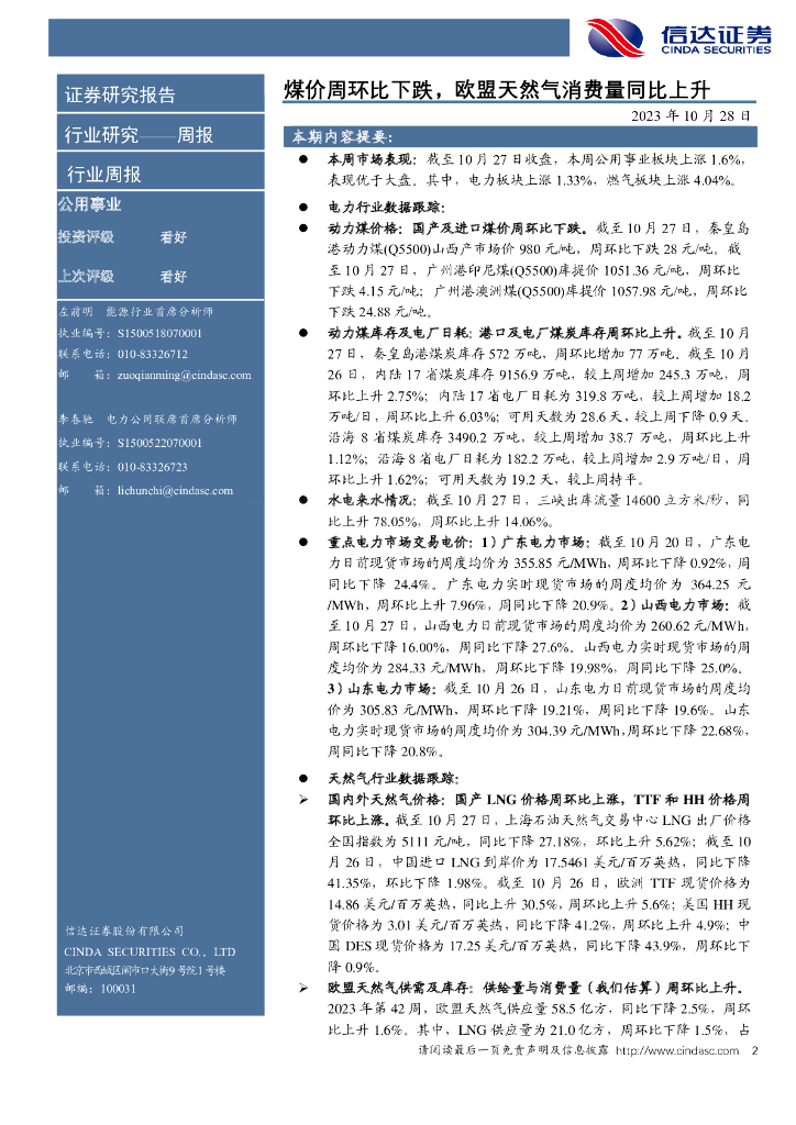信达证券:电力天然气周报:煤价周环比下跌,欧盟天然气消费量同比上升.pdf
