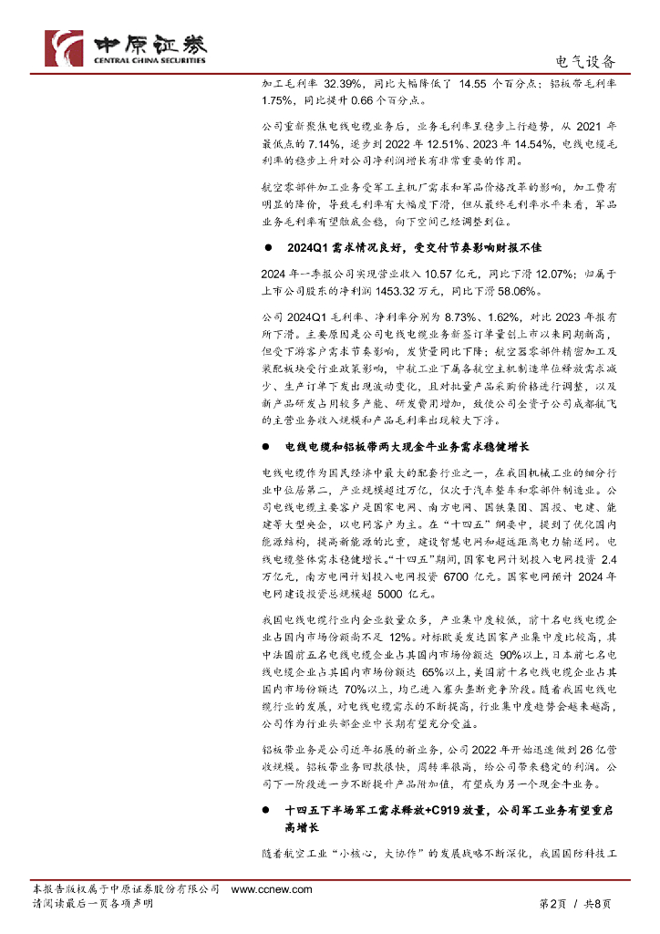 中原证券:通达股份(002560)-2023年报&2024一季报点评:聚焦主业电缆业务稳健增长,航空零部件加工需求有望回升.pdf