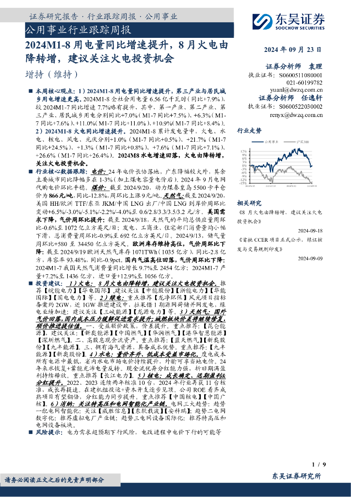 东吴证券:公用事业行业跟踪周报:2024M1-8用电量同比增速提升,8月火电由降转增,建议关注火电投资机会.pdf