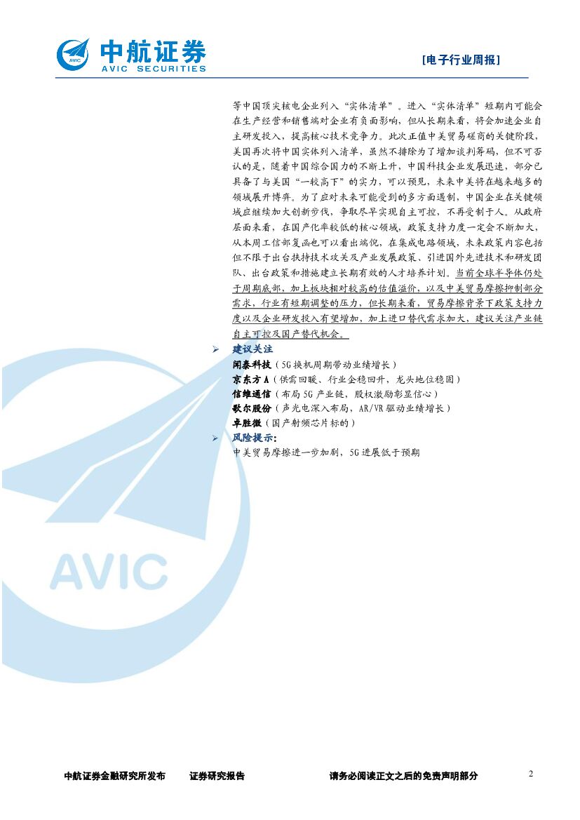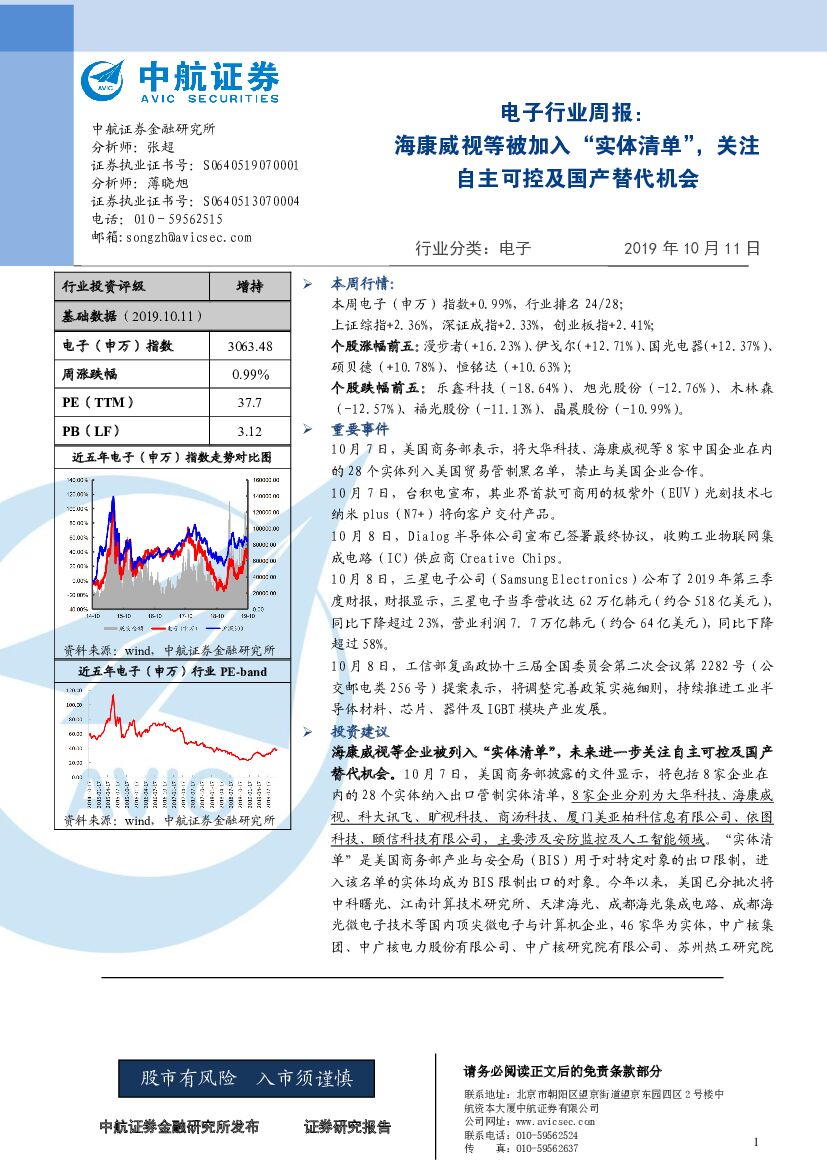 中航证券:电子行业周报:海康威视等被加入“实体清单”,关注自主可控及国产替代机会.pdf