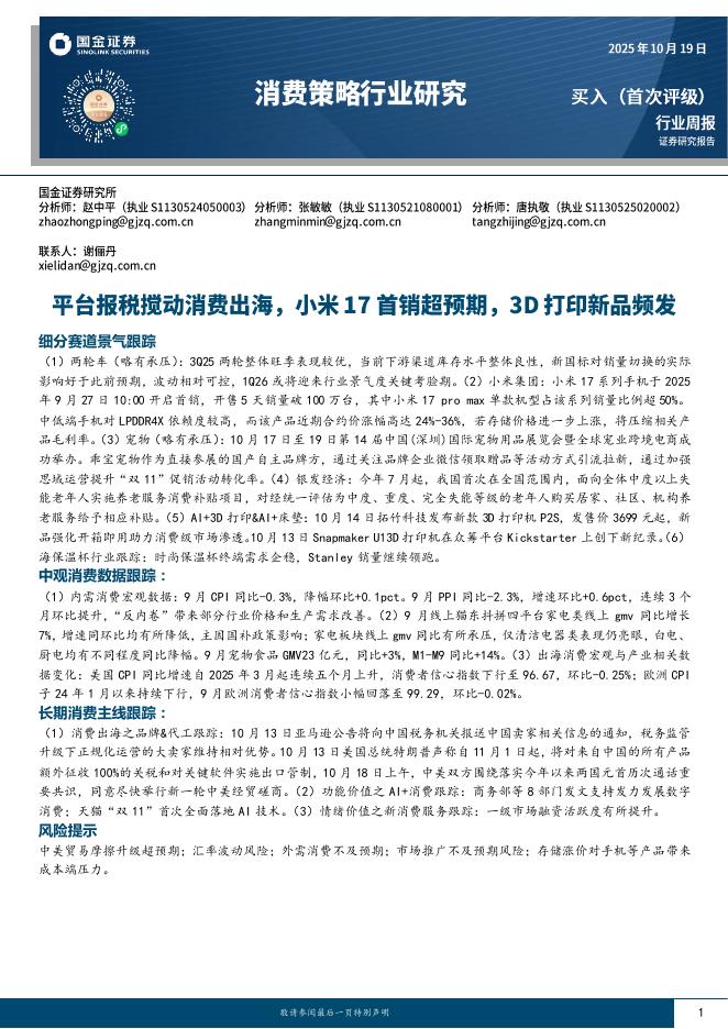 国金证券:消费策略行业研究:平台报税搅动消费出海,小米17首销超预期,3D打印新品频发.pdf