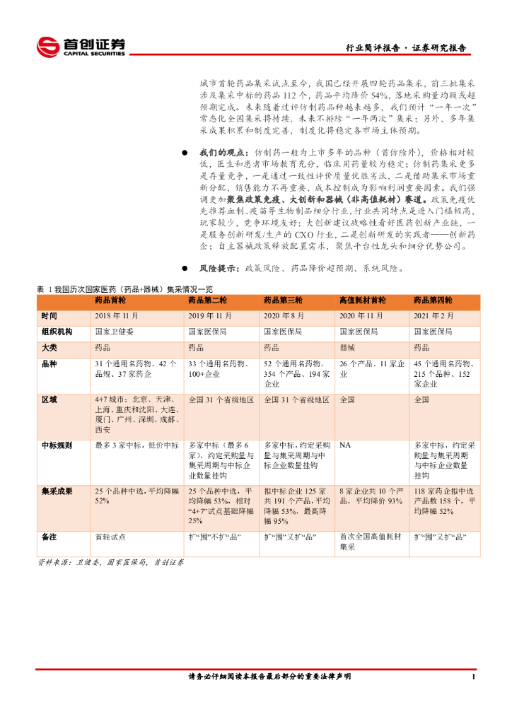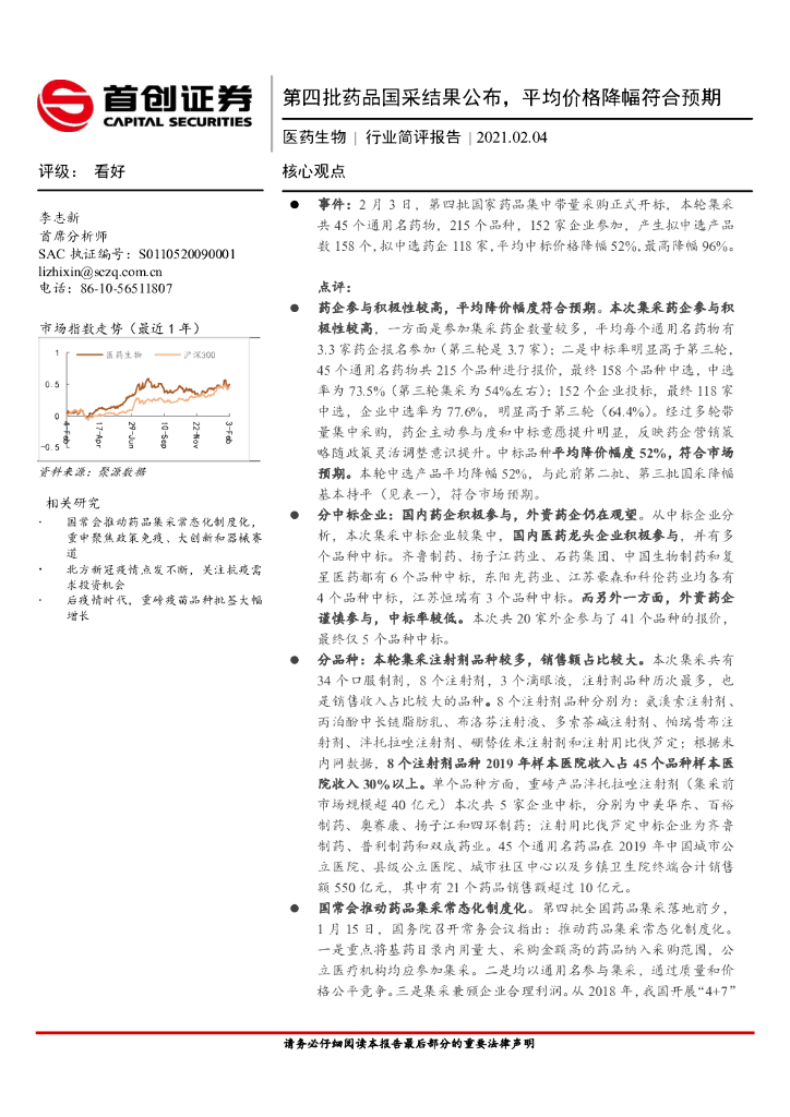 首创证券:医药生物行业简评报告:第四批药品国采结果公布,平均价格降幅符合预期.pdf