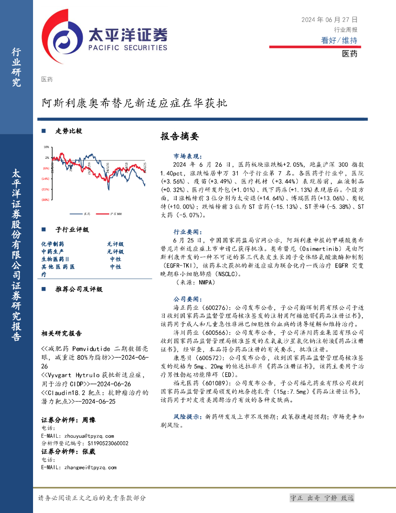 太平洋证券:医药行业周报:阿斯利康奥希替尼新适应症在华获批.pdf