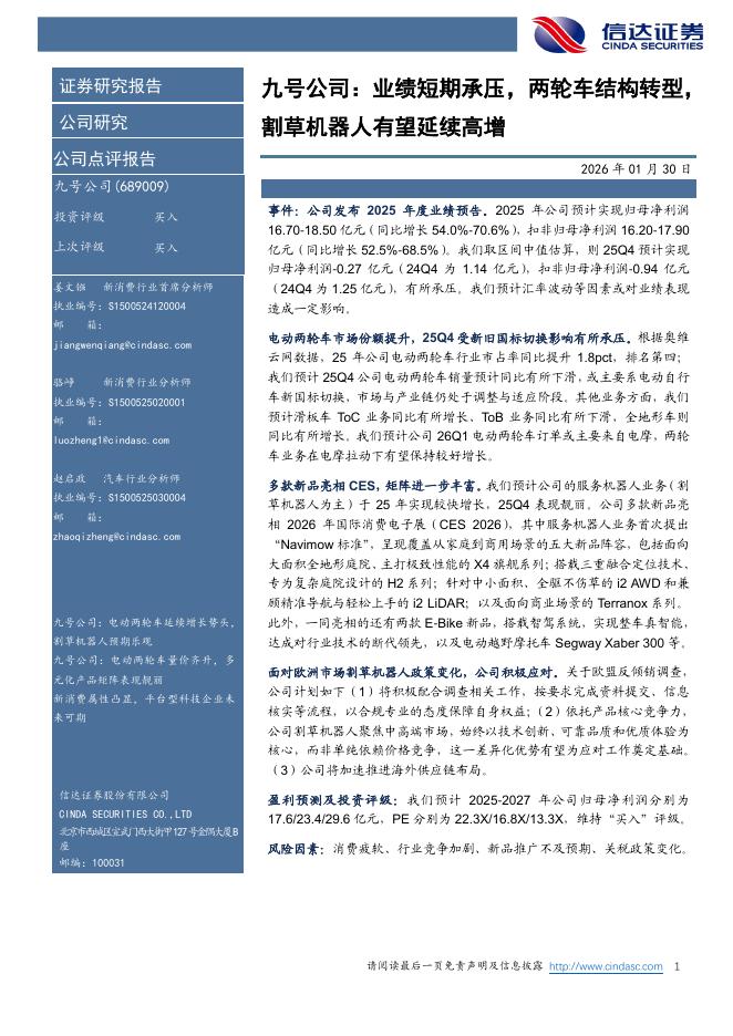 信达证券:九号公司:业绩短期承压,两轮车结构转型,割草机器人有望延续高增.pdf