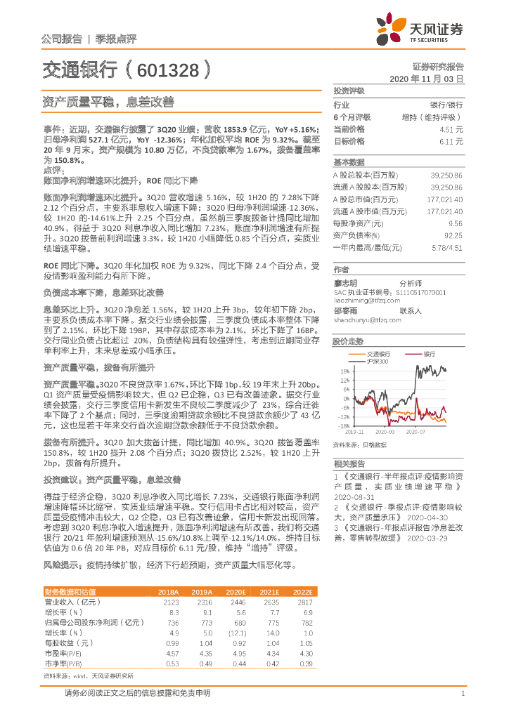 天风证券:交通银行(601328)-资产质量平稳,息差改善.pdf