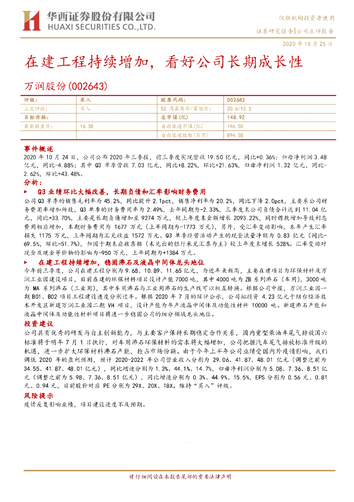 华西证券:万润股份(002643)-在建工程持续增加,看好公司长期成长性.pdf