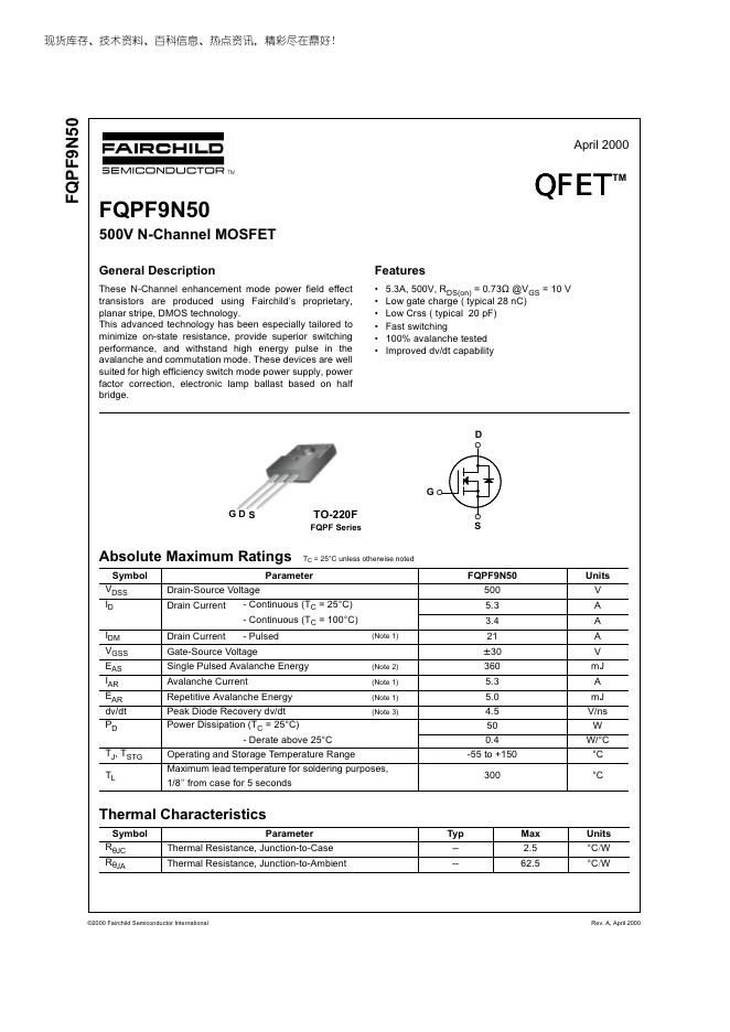 FAIRCHILD FQPF9N50 数据手册.pdf