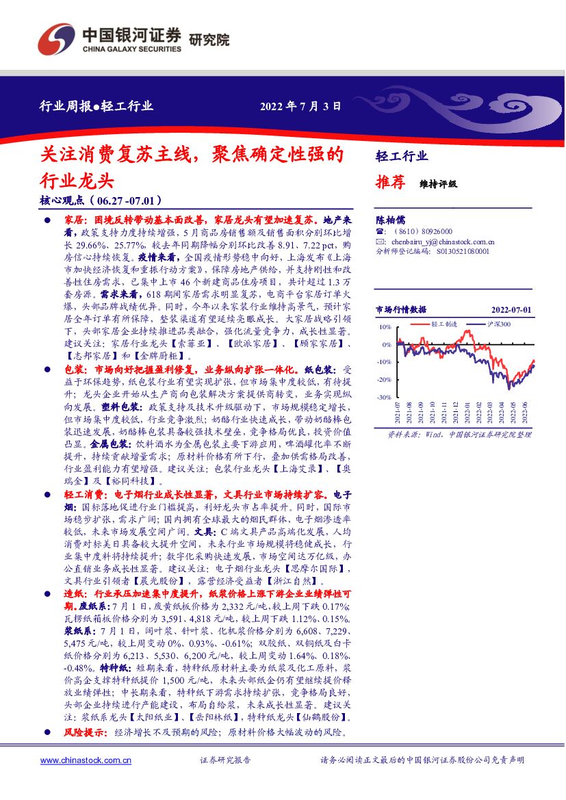中国银河:轻工行业周报:关注消费复苏主线,聚焦确定性强的行业龙头.pdf