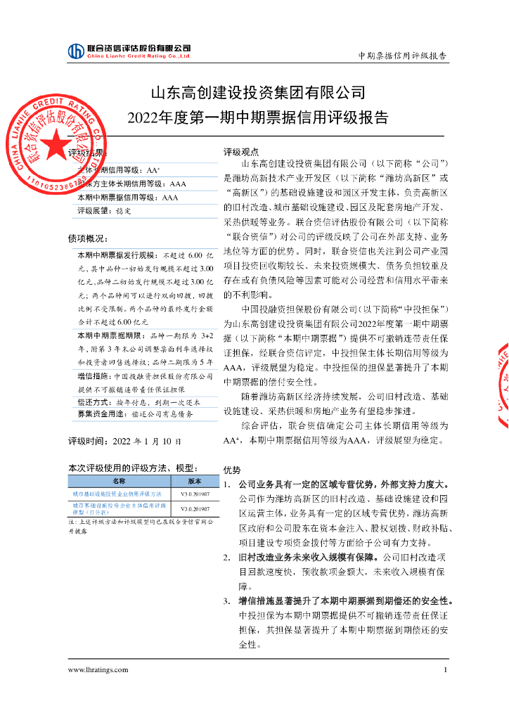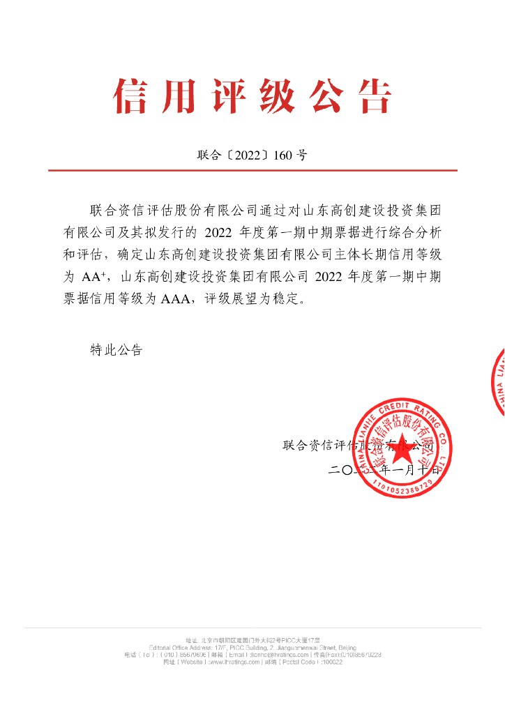 联合资信:山东高创建设投资集团有限公司2022年度第一期中期票据信用评级报告.pdf