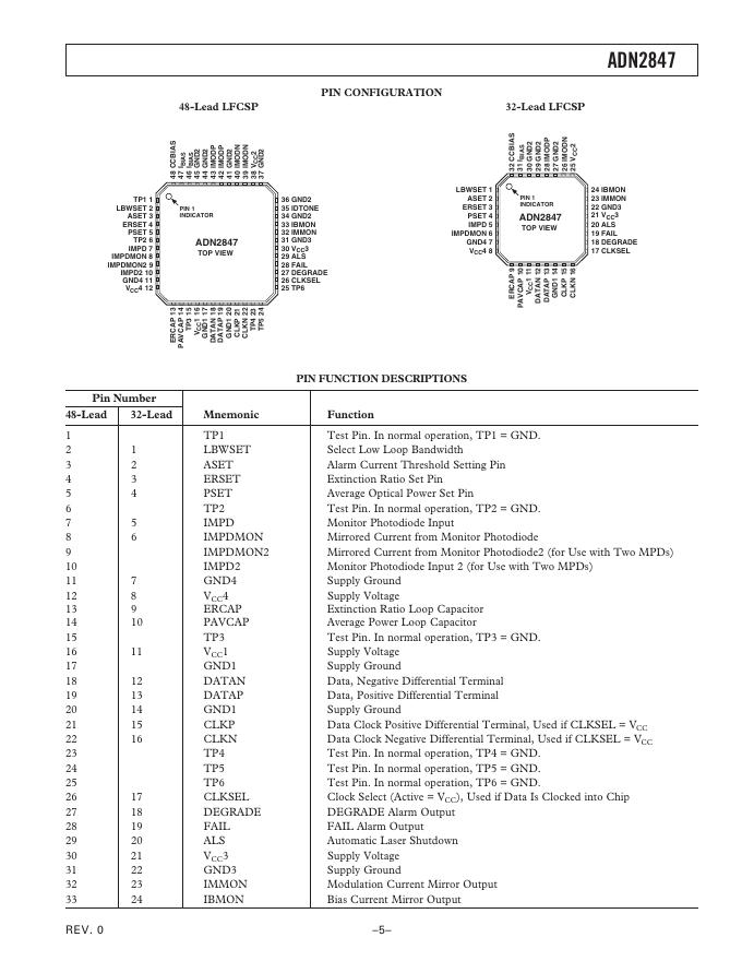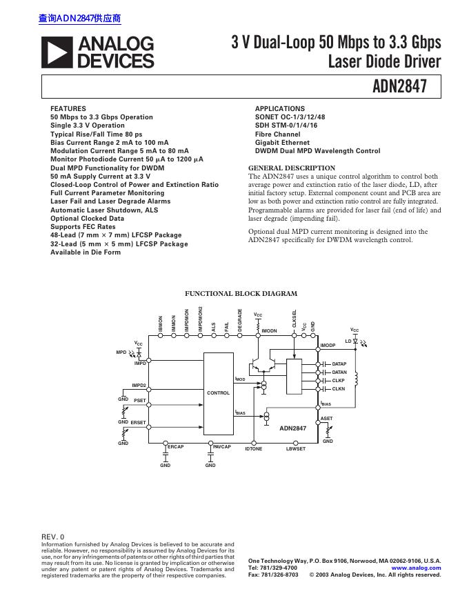 ANALOG DEVICES ADN2847 3 V Dual-Loop 50 Mbps to 3.3 Gbps Laser Diode Driver 数据手册.pdf