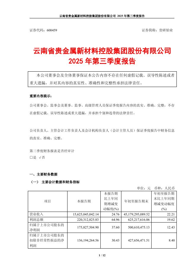 600459-贵研铂业:云南省贵金属新材料控股集团股份有限公司2025年第三季度报告.pdf