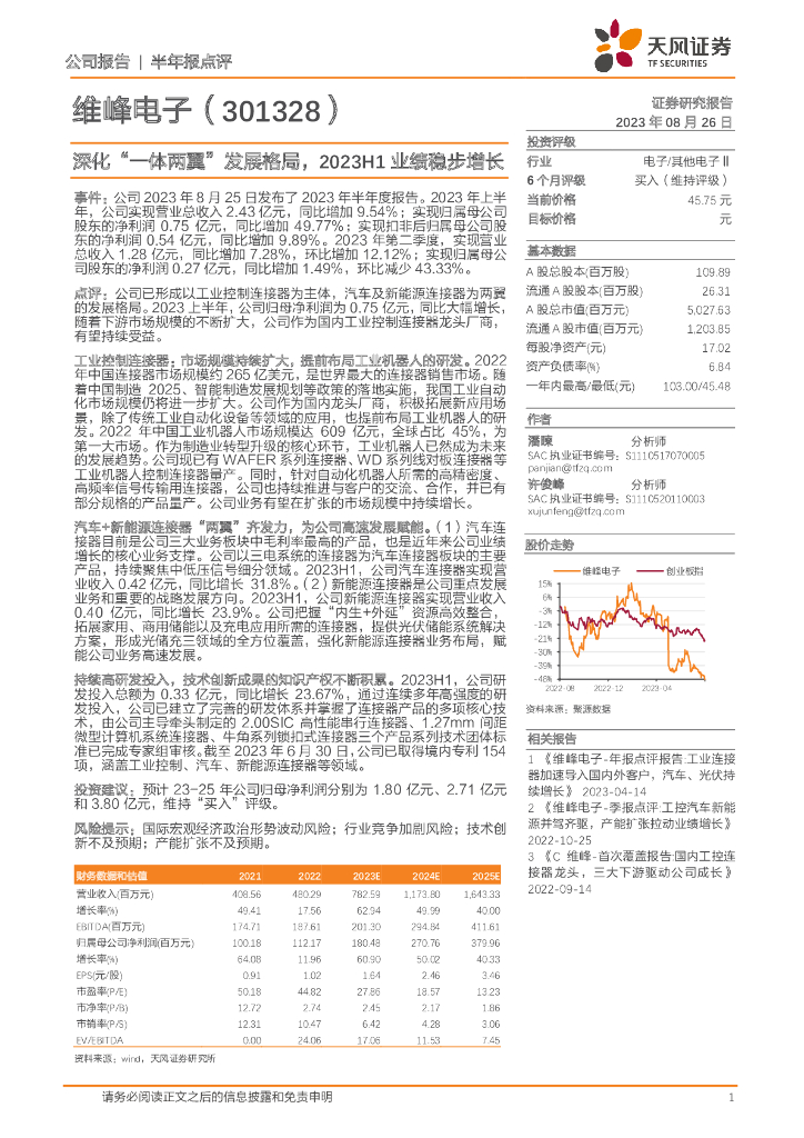 天风证券:维峰电子(301328)-深化“一体两翼”发展格局,2023H1业绩稳步增长.pdf