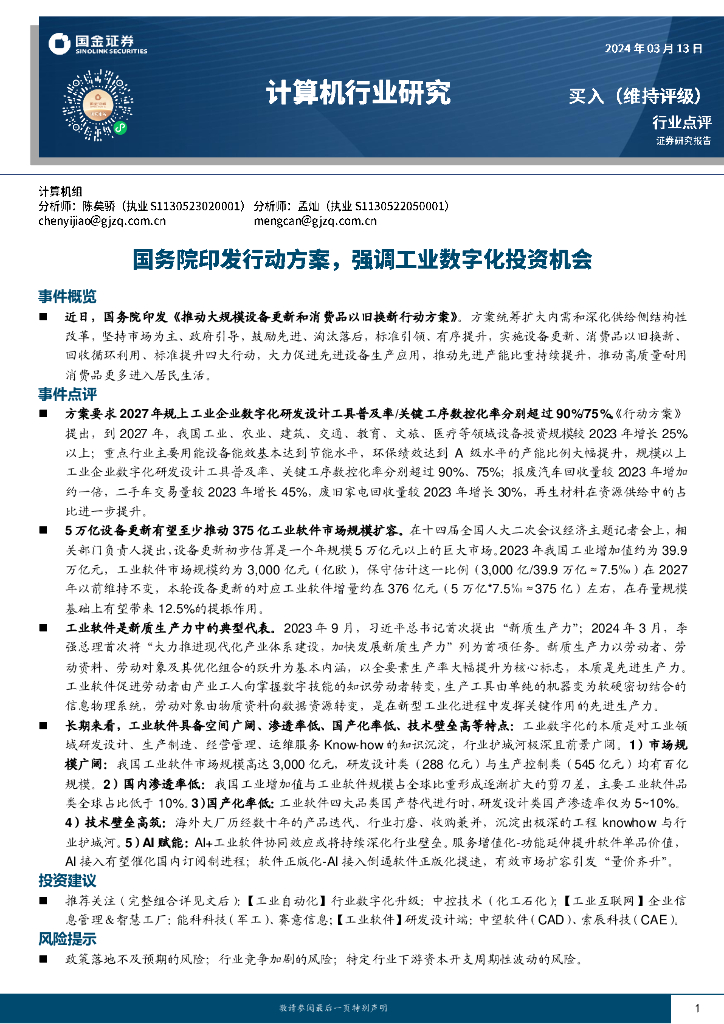 国金证券:计算机行业研究:国务院印发行动方案,强调工业数字化投资机会.pdf