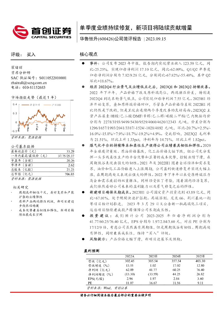 首创证券:华鲁恒升(600426)-公司简评报告:单季度业绩持续修复,新项目将陆续贡献增量.pdf