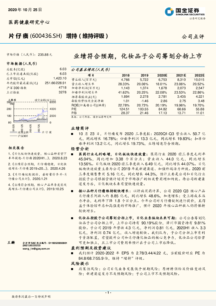国金证券:片仔癀(600436)-业绩符合预期,化妆品子公司筹划分拆上市.pdf