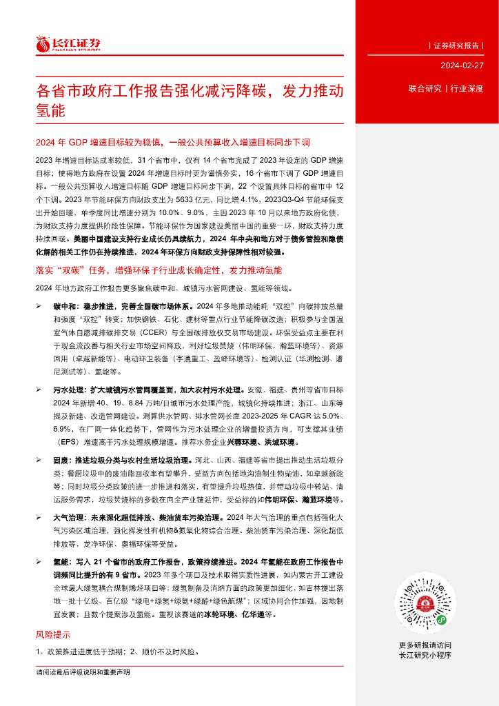 长江证券:环保行业深度:各省市政府工作报告强化减污降碳,发力推动氢能.pdf