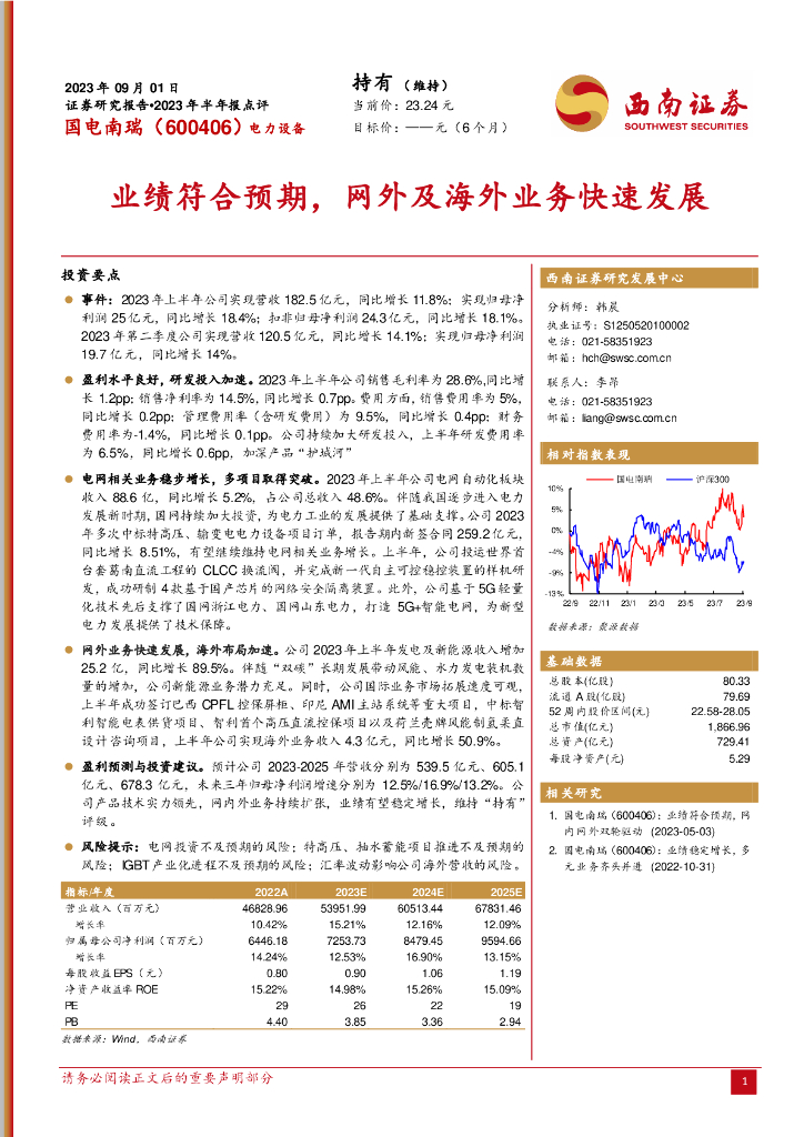 西南证券:国电南瑞(600406)-业绩符合预期,网外及海外业务快速发展.pdf