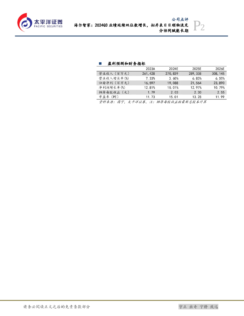 太平洋证券:海尔智家:2024Q3业绩延续双位数增长,拟并表日日顺物流充分协同赋能长期.pdf