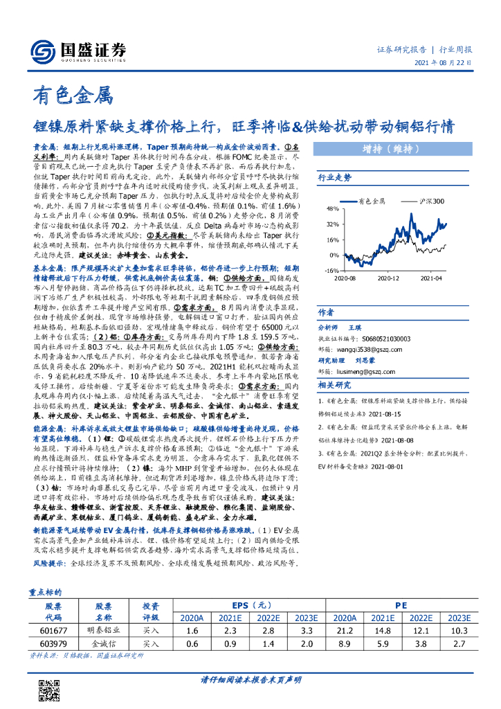 国盛证券:有色金属行业周报:锂镍原料紧缺支撑价格上行,旺季将临&供给扰动带动铜铝行情.pdf