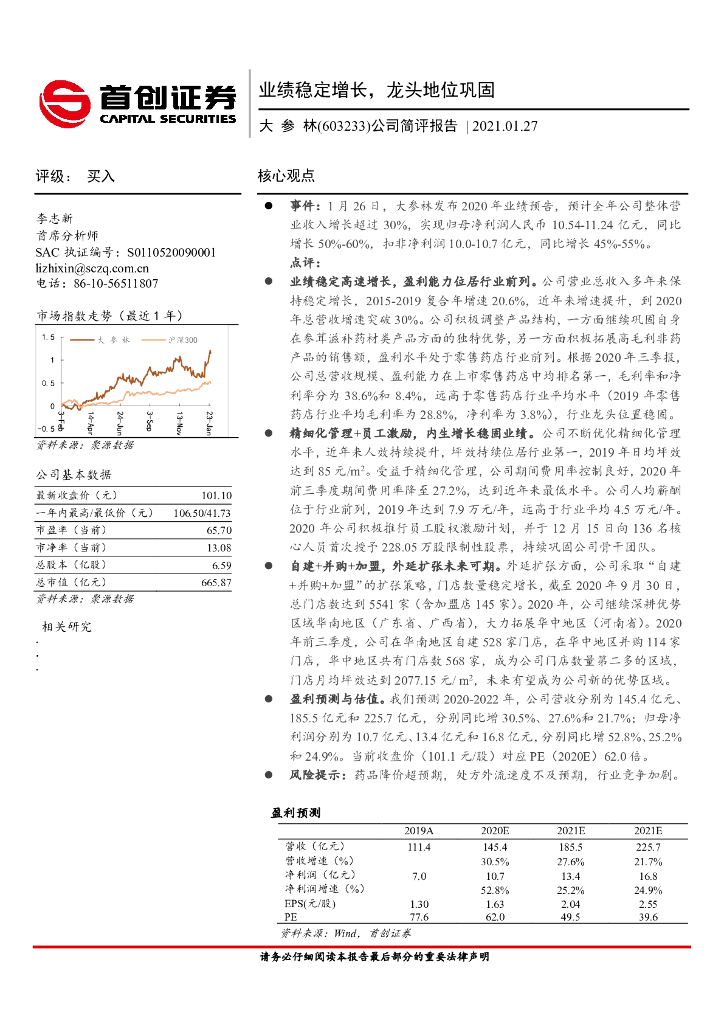 首创证券:大参林(603233)-公司简评报告:业绩稳定增长,龙头地位巩固.pdf