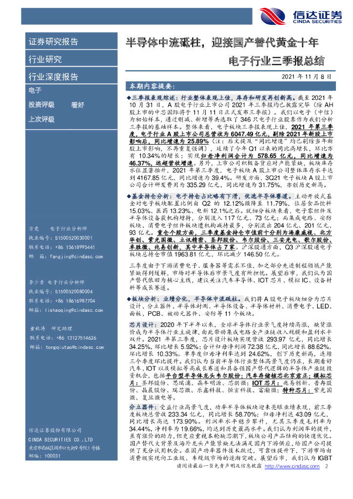 信达证券:电子行业三季报总结:半导体中流砥柱,迎接国产替代黄金十年.pdf