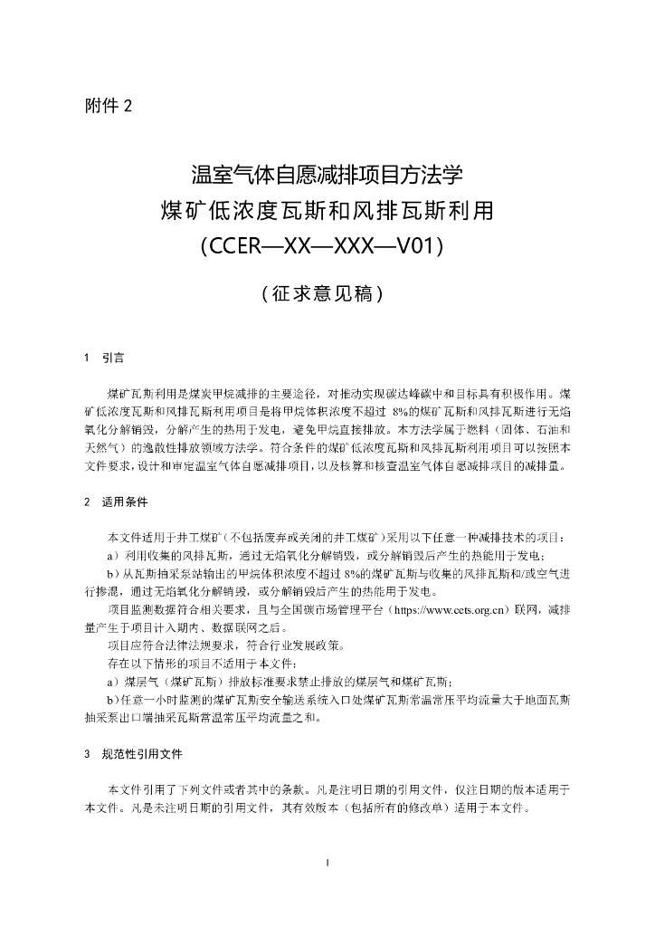温室气体自愿减排项目方法学 煤矿低浓度瓦斯和风排瓦斯利用(CCER—XX—XXX—V01)(征求意见稿).pdf