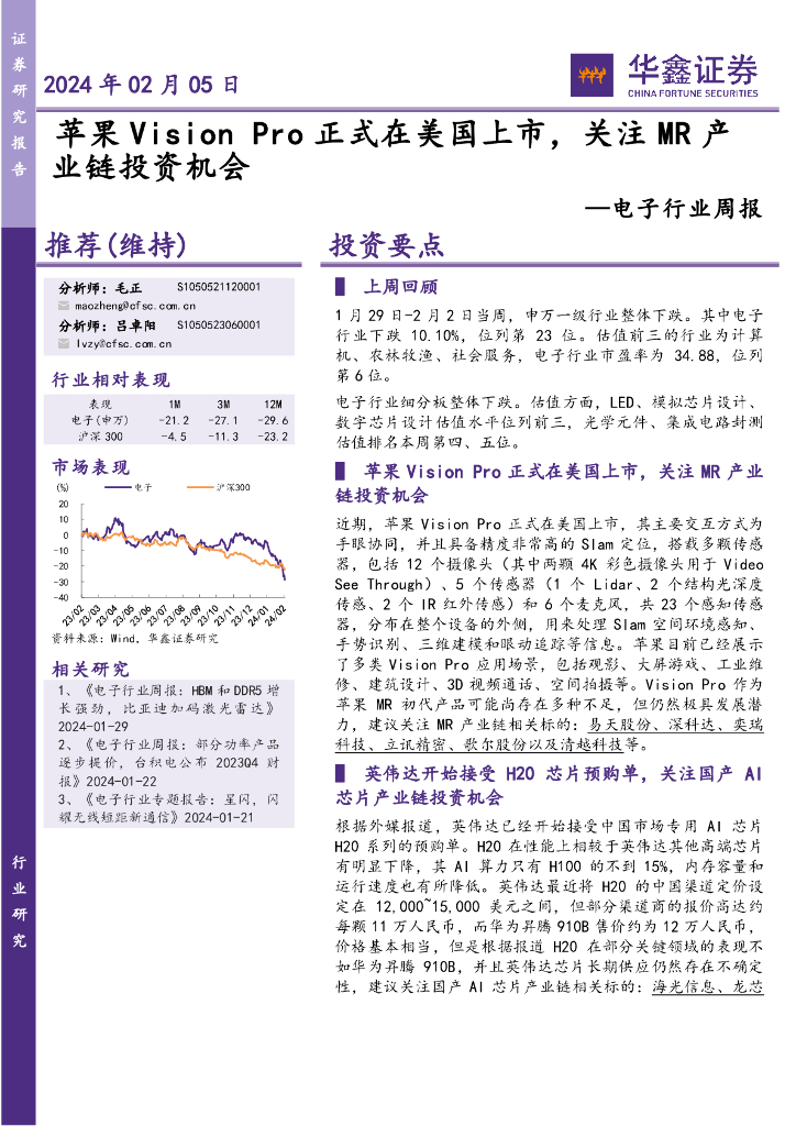 华鑫证券:电子行业周报:苹果Vision Pro正式在美国上市,关注MR产业链投资机会.pdf