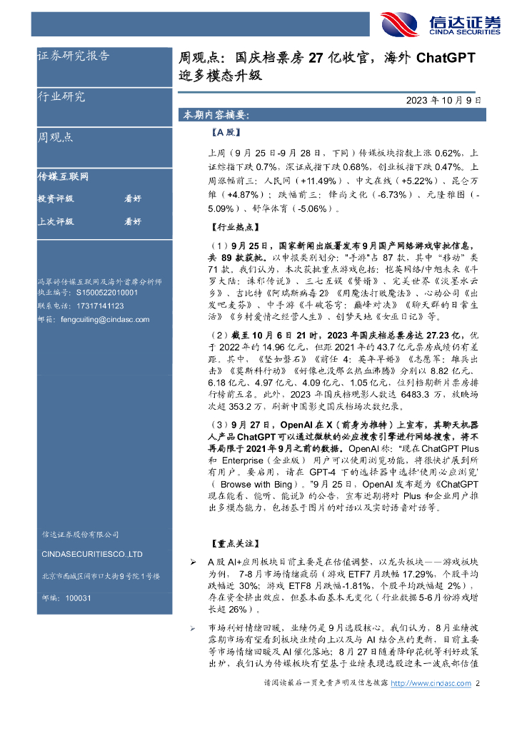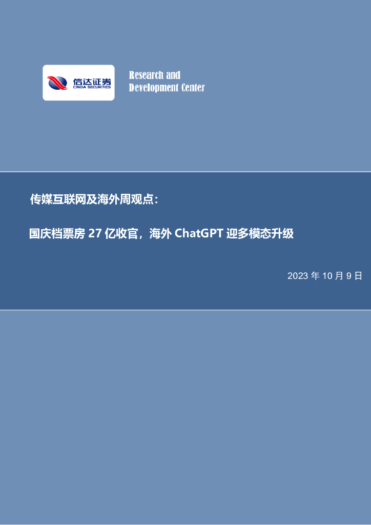 信达证券:传媒互联网及海外周观点:国庆档票房27亿收官,海外ChatGPT迎多模态升级.pdf