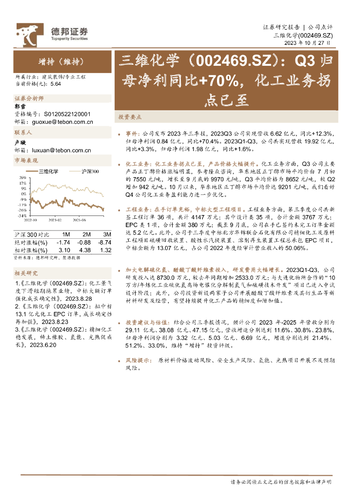 德邦证券:三维化学(002469)-Q3归母净利同比+70%,化工业务拐点已至.pdf