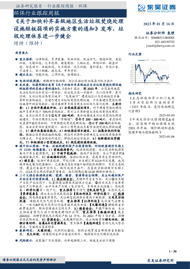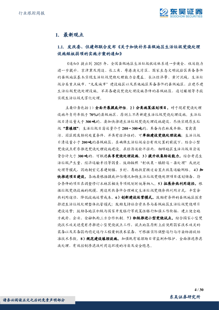 东吴证券:环保行业跟踪周报:《关于加快补齐县级地区生活垃圾焚烧处理设施短板弱项的实施方案的通知》发布,垃圾处理体系进一步健全.pdf