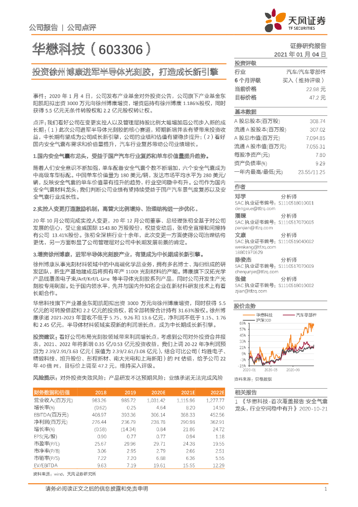 天风证券:华懋科技(603306)-投资徐州博康进军半导体光刻胶,打造成长新引擎.pdf