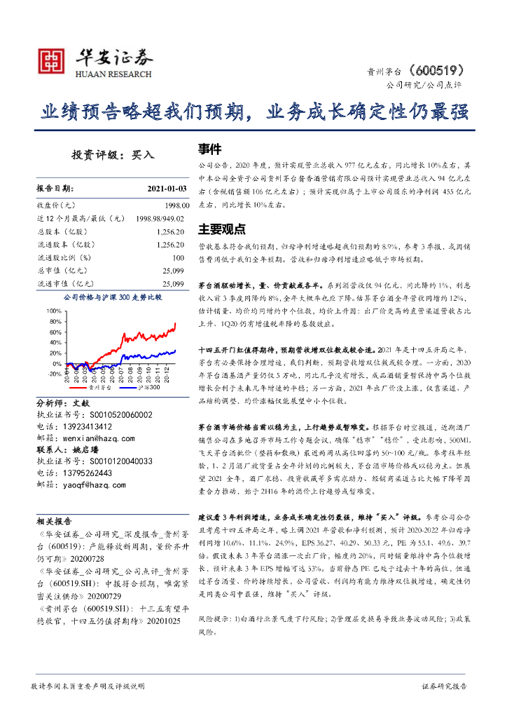 华安证券:贵州茅台(600519)-业绩预告略超我们预期,业务成长确定性仍最强.pdf