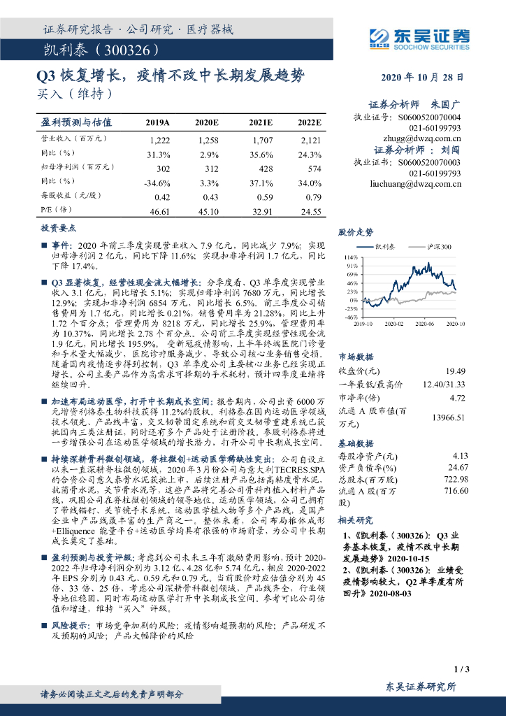 东吴证券:凯利泰(300326)-Q3恢复增长,疫情不改中长期发展趋势.pdf
