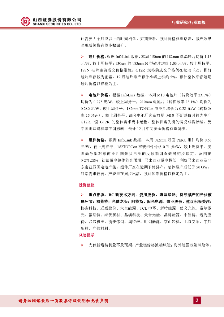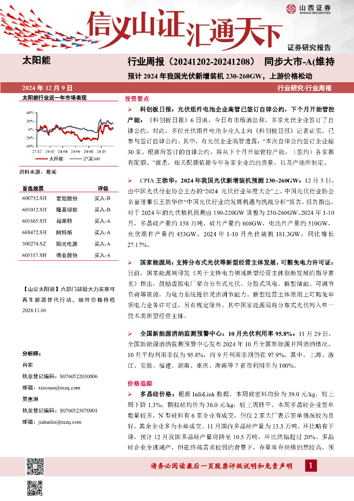 山西证券:太阳能行业周报:预计2024年我国光伏新增装机230-260GW,上游价格松动.pdf