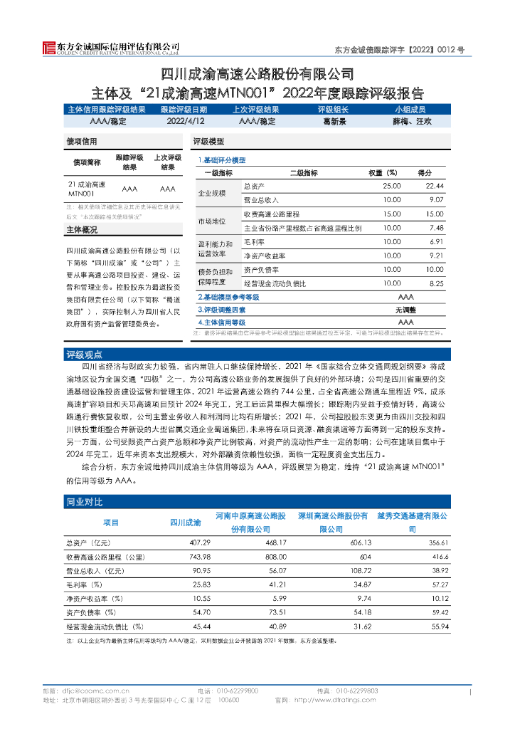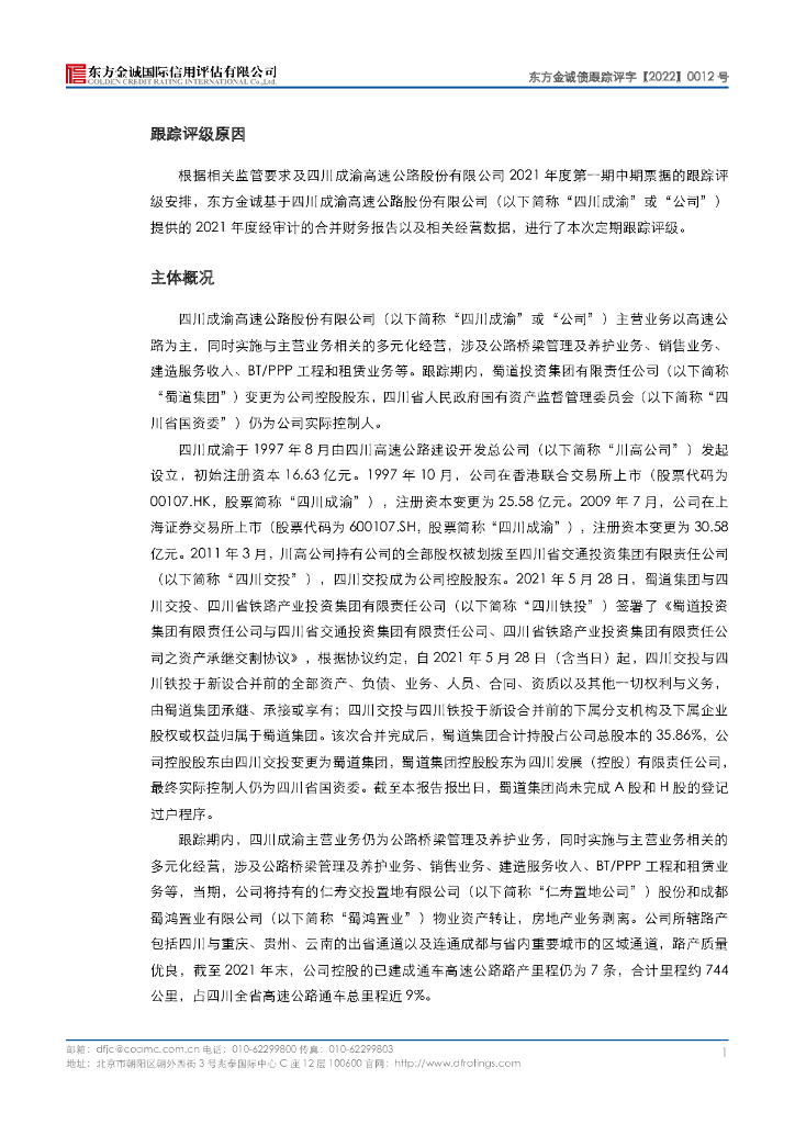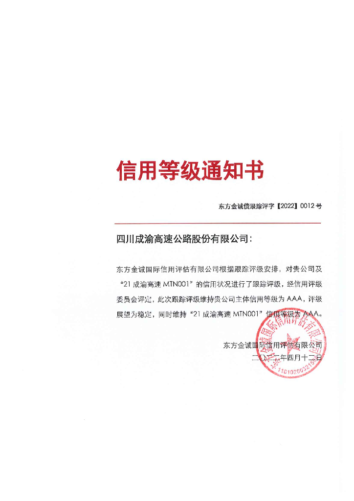 东方金诚:四川成渝高速公路股份有限公司主体及“21成渝高速MTN001”2022年度跟踪评级报告.pdf