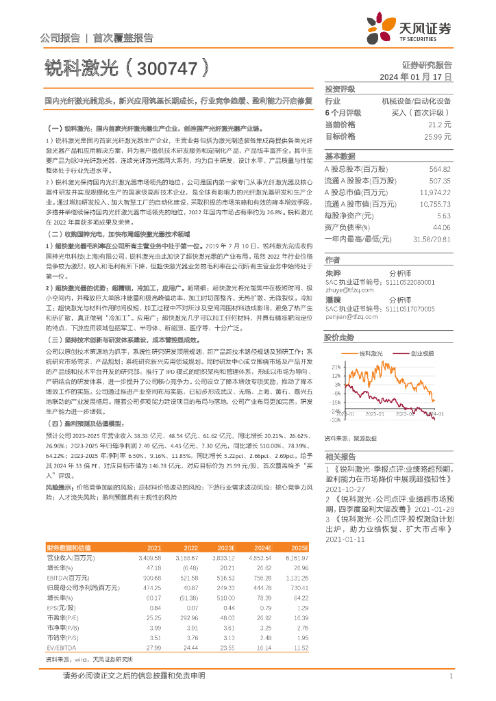 天风证券:锐科激光(300747)-国内光纤激光器龙头,新兴应用筑基长期成长,行业竞争趋缓、盈利能力开启修复.pdf