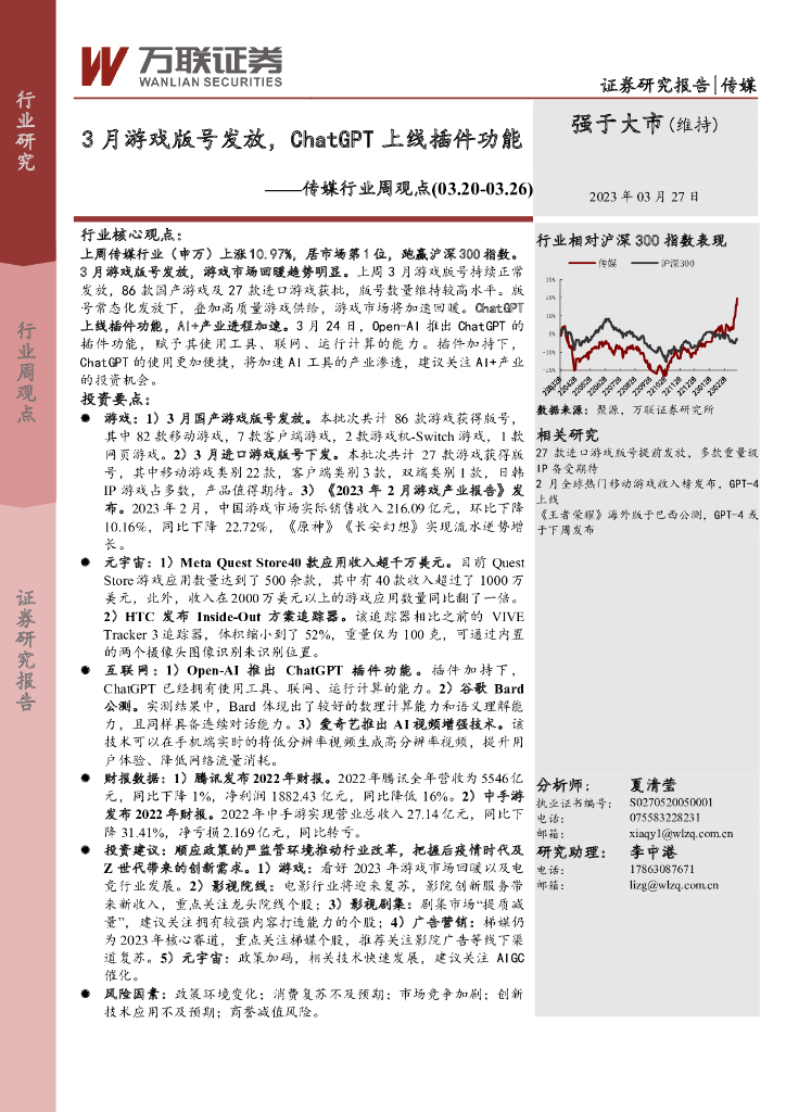 万联证券:传媒行业周观点:3月游戏版号发放,ChatGPT上线插件功能.pdf
