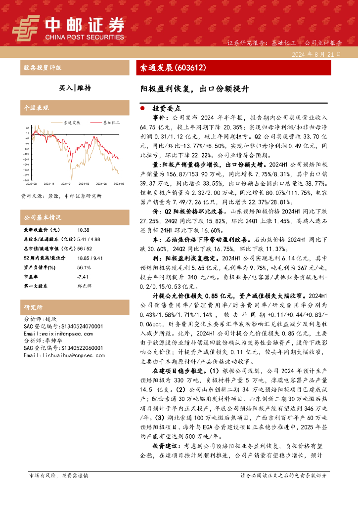 中邮证券:索通发展(603612)-阳极盈利恢复,出口份额提升.pdf