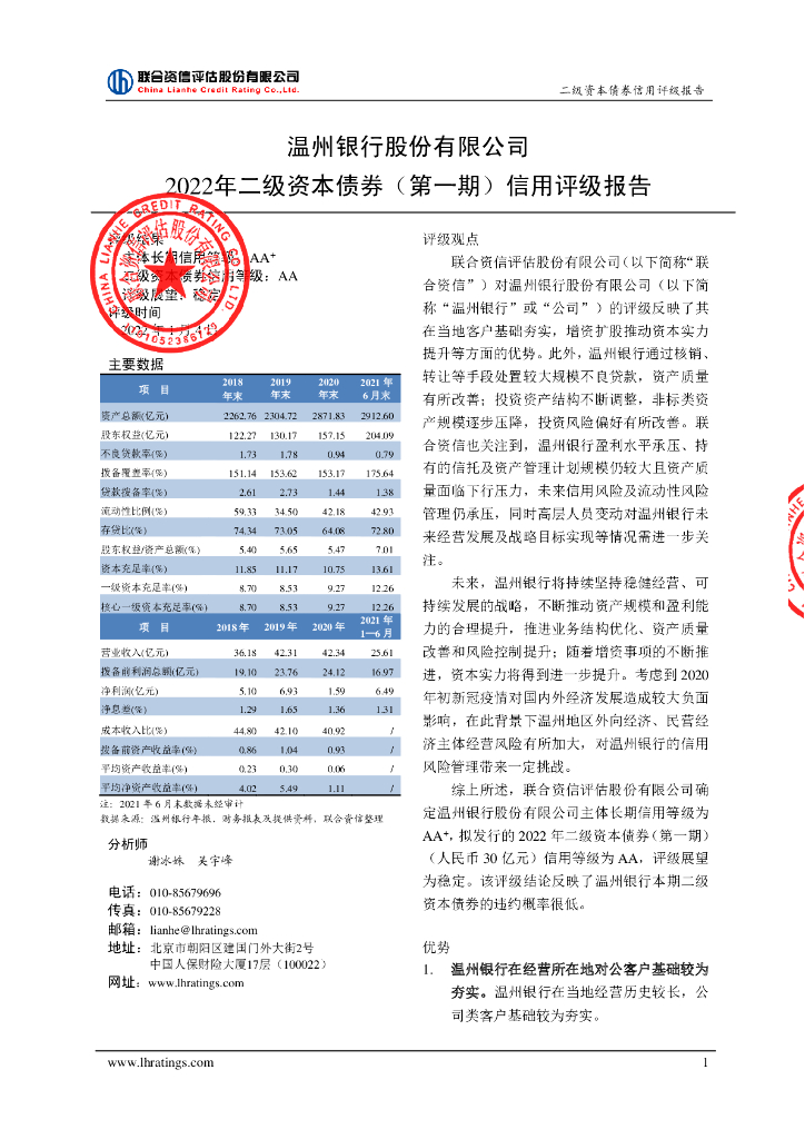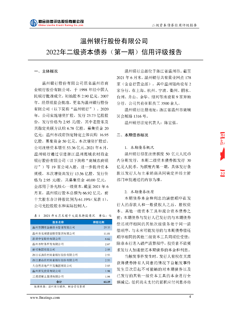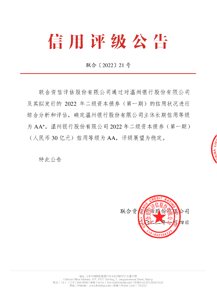 联合资信:温州银行股份有限公司2022年二级资本债券(第一期)信用评级报告及跟踪评级安排.pdf
