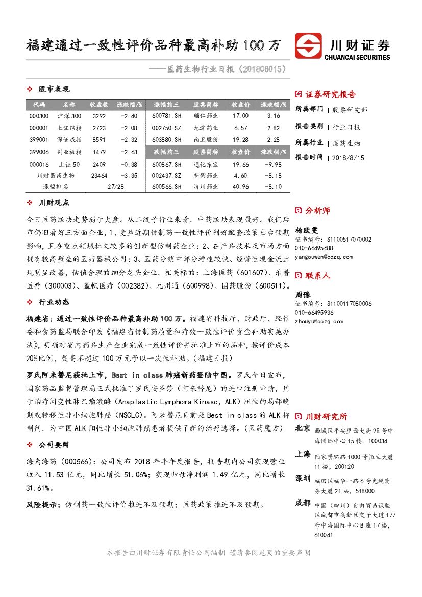 川财证券:医药生物行业日报:福建通过一致性评价品种最高补助100万.pdf