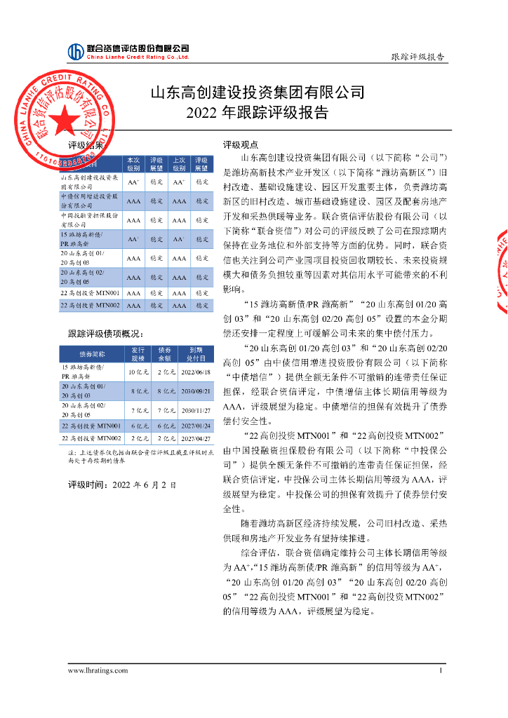 联合资信:山东高创建设投资集团有限公司2022年跟踪评级报告.pdf
