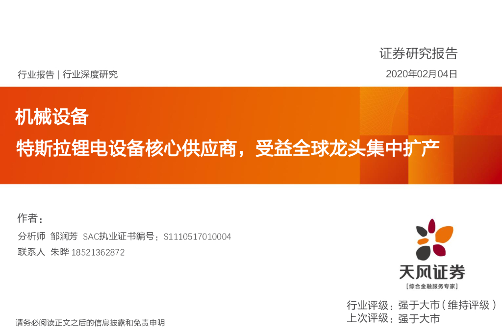 天风证券:机械设备行业深度研究:特斯拉锂电设备核心供应商,受益全球龙头集中扩产.pdf